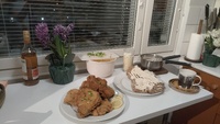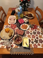Illallinen etuajassa, ruokajuomana aperatiivina kossua, ruoan kanssa kaljaa ja punaviiniä.